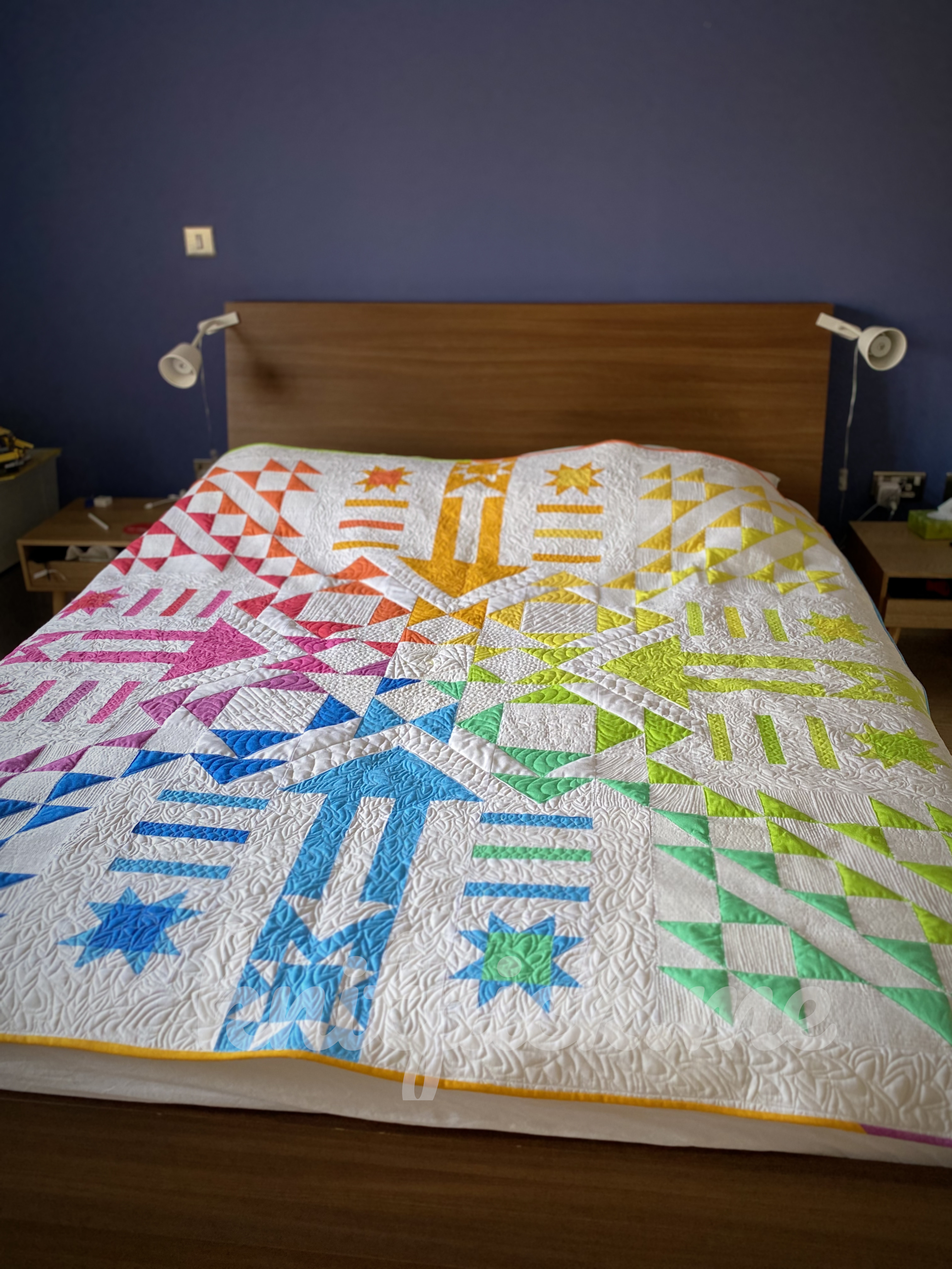 - Fraktal Quilt: This is a quilt I made for my mother. I haven't dared washing it yet, it is wool batting, but I am hoping it will be ok due to it being the same batting I used for a mystery quilt that has been washed a few times happily. I finished the quilting and binding July 19th, after having started this quilt back in 2020.